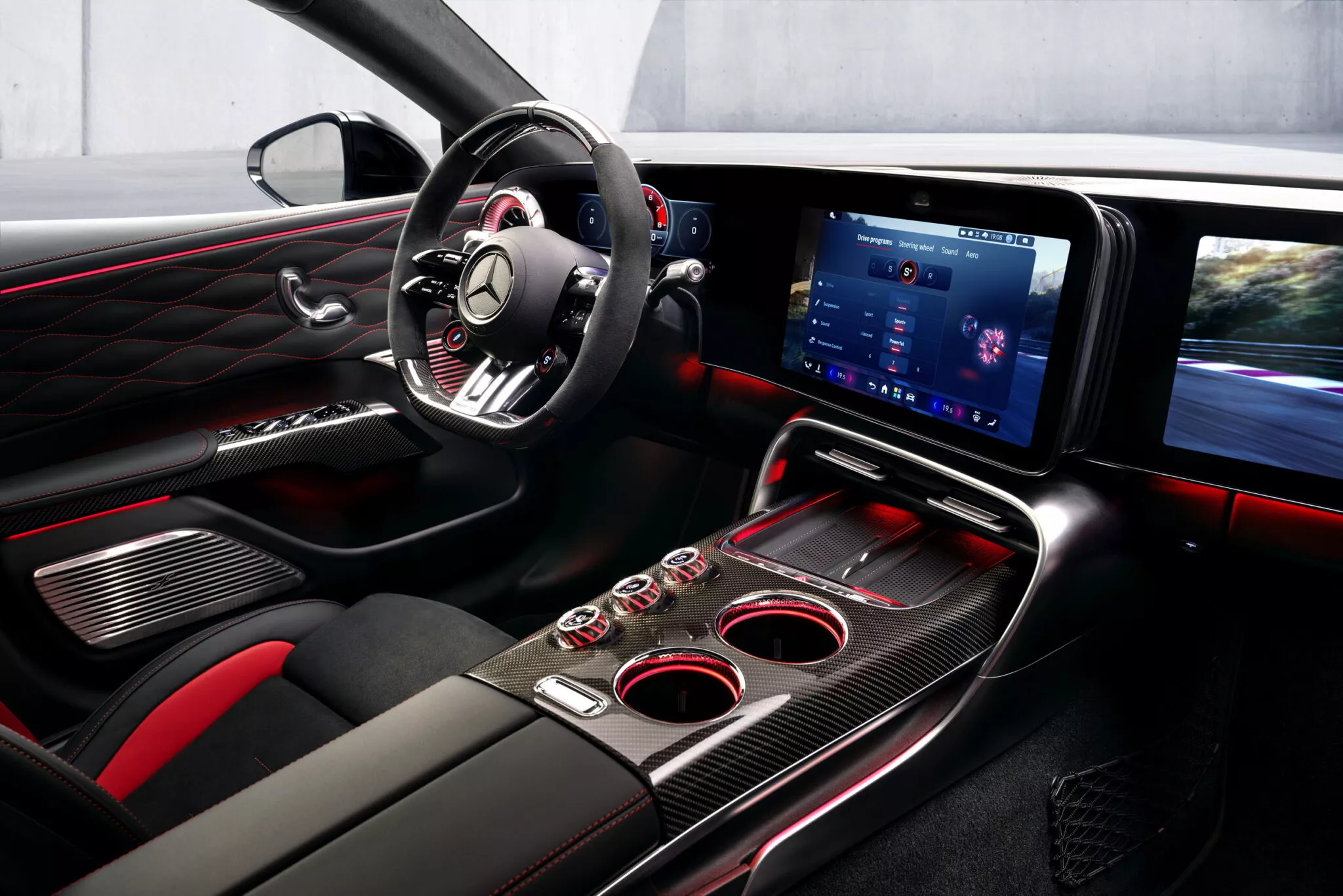 There are still some tactile elements left in place. Three chunky rotary controllers sit in the center tunnel, and they are not decorative. Response Control alters the behavior of the e-motors and the accelerator pedal, Agility Control adjusts cornering characteristics, and Traction Control provides nine stages of intervention through the new AMG Race Engineer system. The driver can also reach key functions through two steering wheel buttons with their own LCDs.