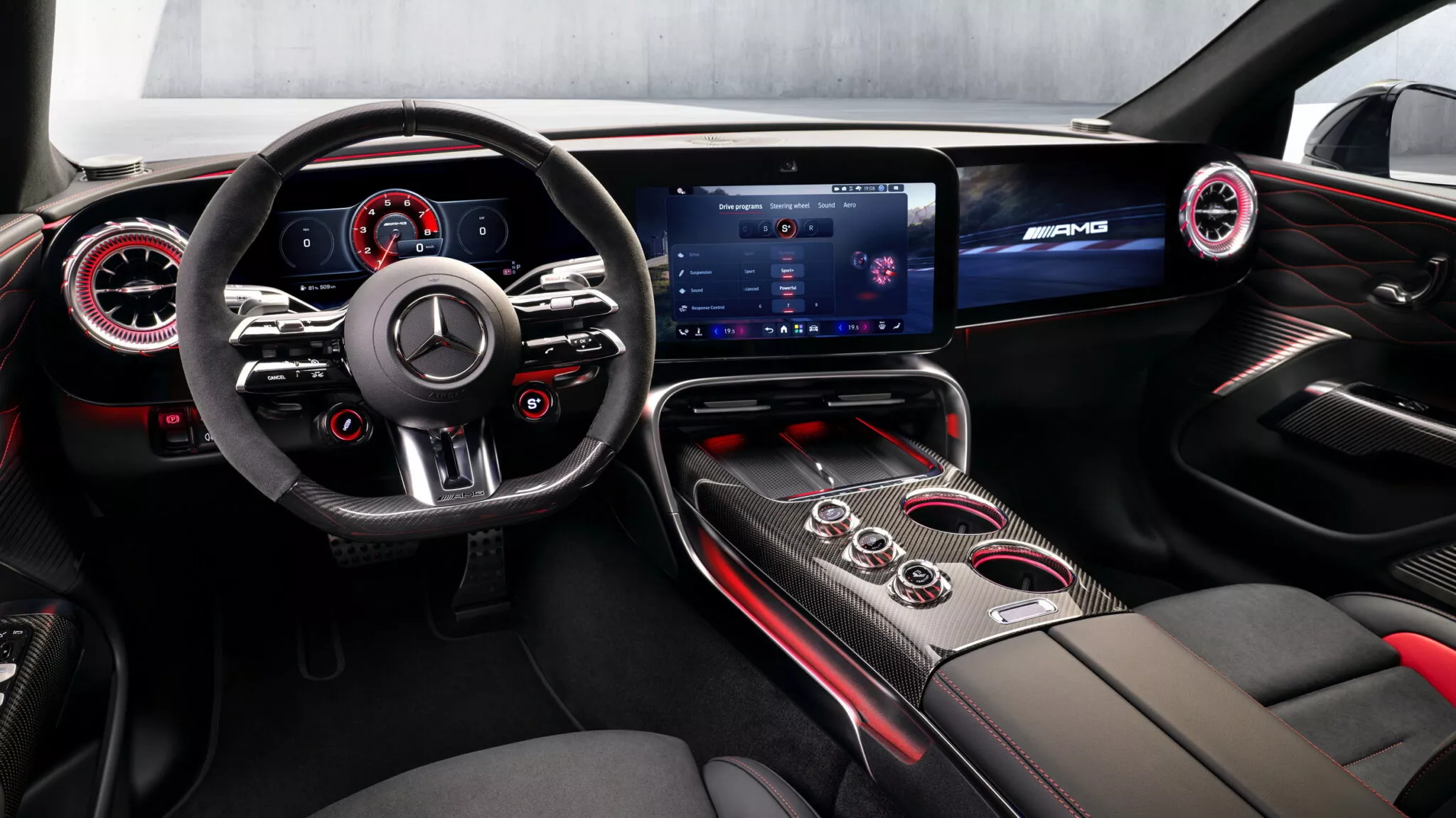 The rest of the cabin leans hard into AMG theater. Illuminated climate vents are styled to resemble jet engines, while the flat-bottom steering wheel gets carbon accents and haptic feedback. Optional AMG Performance seats are available, and a metal-like wing element runs across the center console. Up front, Mercedes adds illuminated cup holders and dual wireless charging trays.